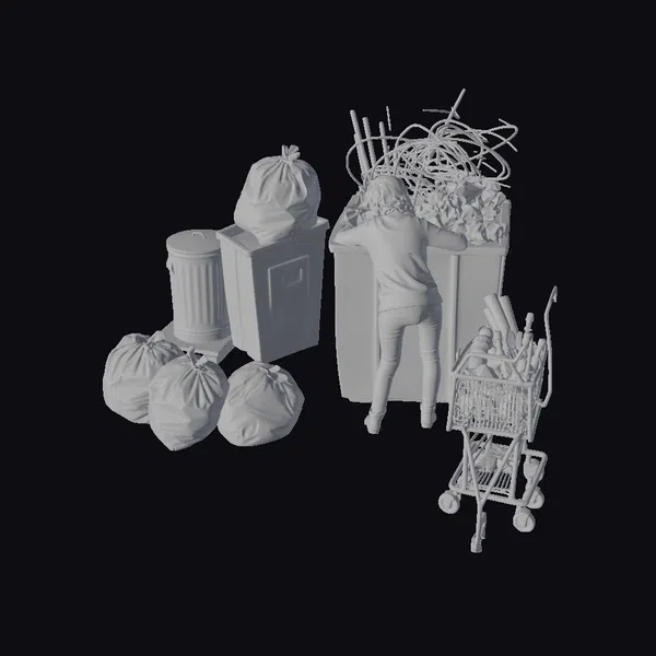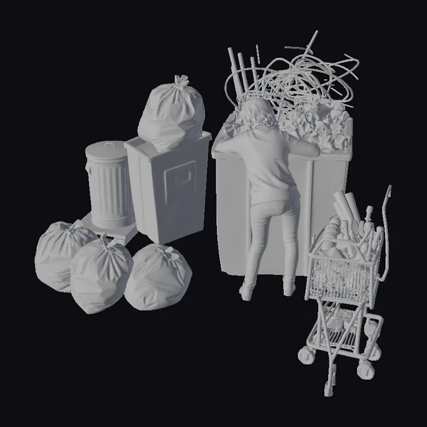 The Model “Woman Searching Trash Cans” is also available upon request in many other 3D formats, such as 3MF, BLEND, FBX, OBJ, USDZ and others, making it easy to integrate into your project.