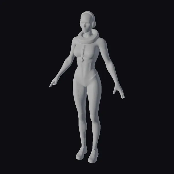 Detailed with precision, this 3D model showcases a young woman in a casual yet stylish ensemble. She wears a grey cropped hoodie with bold white lettering, fitted black leggings, and sleek white shoes. Her hair is pulled back, and she dons modern white headphones. The model’s pose is relaxed, with arms slightly bent and down. Her facial features are finely detailed, contributing to a realistic appearance. The model’s outfit and accessories make her a versatile character for various projects, including games, animation, and design. The high level of detail in her clothing and accessories allows for a wide range of applications, from virtual reality experiences to 3D printing.