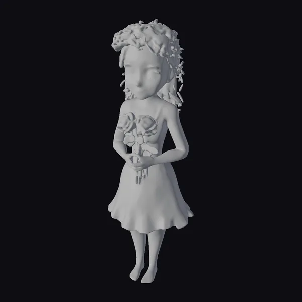 Rendered in exquisite detail, the woman’s stylized form showcases a beautiful, youthful face framed by a messy bob of brown hair, her eyes sparkling with a subtle smile. Her dandelion crown, a riot of yellow, orange, and green hues, adds a playful touch to her overall appearance. The flowing sky blue dress with white polka dots complements her youthful charm, while the pair of red roses she holds adds a pop of color and a sense of romance. This model is perfect for use in games, animations, or as a decorative piece in design projects, offering a versatile and eye-catching character that can bring life to various creative endeavors.