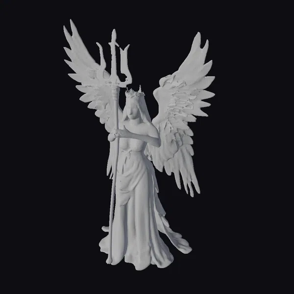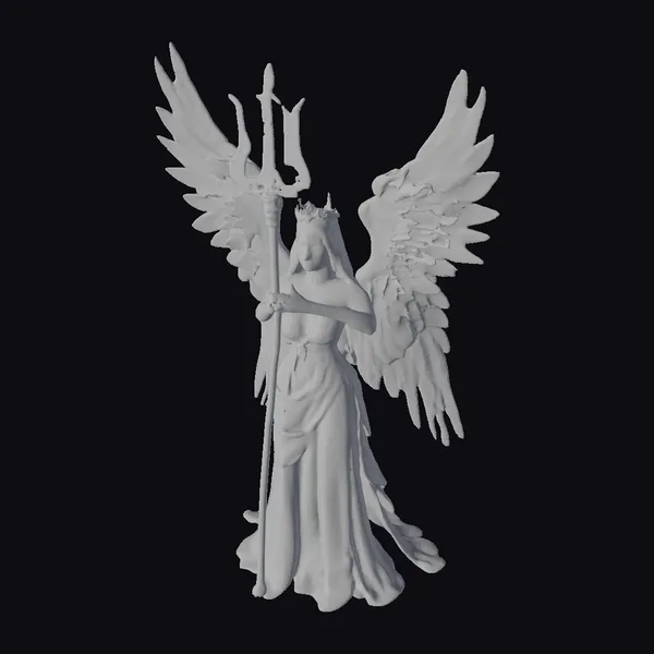 This stunning model depicts a woman with the majestic attributes of an angel, standing tall with a confident posture. Her long, flowing brown hair and bright, expressive eyes are meticulously detailed. The golden crown on her head adds a touch of royalty, while her blue and yellow dress, cinched at the waist with a golden belt, flows beautifully around her. The focal point of her power is the golden trident she grips firmly, symbolizing her strength and authority. Her wings, a magnificent blend of white and gold feathers, are spread wide, suggesting both protection and ascension. The model is rich in detail, from the texture of her dress to the intricate design of her crown and the trident. It is perfect for use in various projects, including games, animations, virtual reality experiences, and architectural visualizations, where a symbol of power and grace is needed.