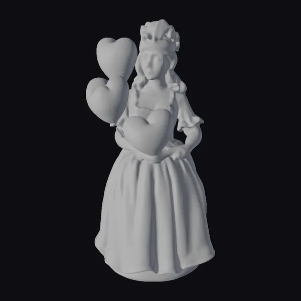 Rendered in stunning detail, this realistic 3D model captures a woman in a majestic pose, lifted by two heart-shaped balloons while cradling a large red heart in her hands. Her 18th-century dress, a beautiful blend of pink and red hues, is intricately designed with a pattern of small hearts, complemented by a matching hat atop her curly, light-brown hair. The model’s facial features are finely tuned, exuding a sense of serenity and charm. The balloons, one large red heart and two smaller pink ones speckled with red hearts, add a playful contrast to her poised demeanor. This model is perfect for projects requiring a touch of historical elegance with a modern twist, suitable for use in games, 3D printing, VR/AR experiences, animation, and design projects.