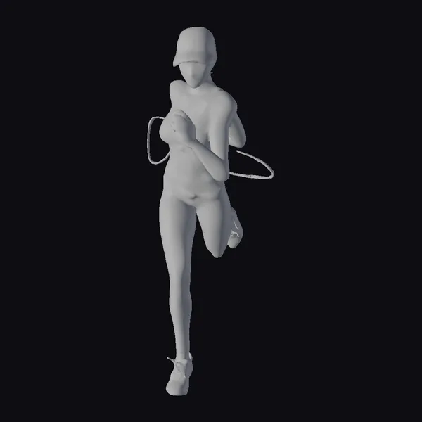 Rendered in exquisite detail, this 3D model captures a woman in the midst of a dynamic workout session. Her facial expression exudes focus and exertion, with a single bead of sweat trickling down her forehead. The jump rope, a blur of motion, arcs around her body. Her athletic wear, a combination of a black sports bra and leggings, showcases her toned physique. The outfit is complemented by a black cap and sleek sneakers, completing her sporty ensemble. This model is perfect for projects requiring a realistic depiction of fitness and athleticism, suitable for use in animations, games, VR/AR experiences, and design visualizations.