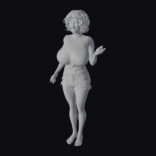 In a dynamic pose, the woman showcases a large snail shell prominently on her chest, as if it’s a bold fashion statement. Her curly red hair bounces with her movement, complementing her short-sleeved dark blue t-shirt adorned with the snail shell graphic. The ripped denim shorts and blue flip-flops complete her casual summer look. The snail shell itself is a marvel of detail, with swirling patterns of yellow, orange, and red that catch the light. This model is perfect for projects requiring a touch of fantasy and humor, such as animations, games, or even VR/AR experiences. Its stylized nature allows it to blend into various environments, from realistic settings to more fantastical worlds.
