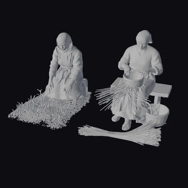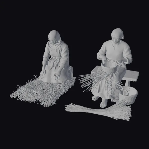 In a beautifully rendered scene, two women are captured in moments of quiet dedication. The first woman, dressed in a flowing blue dress and white headscarf, gently touches the soil around delicate green shoots, symbolizing growth and renewal. Nearby, her companion, clad in earthy tones, meticulously crafts a broom from golden straw, her hands moving with practiced ease. The broom, baskets, and rustic bench add to the authenticity of the scene, transporting the viewer to a simpler, more peaceful time. The level of detail in their clothing, the textures of the natural materials, and the soft, realistic lighting all contribute to a highly immersive experience. This 3D model is perfect for projects requiring a historical or rural setting, such as animations, games, or architectural visualizations.