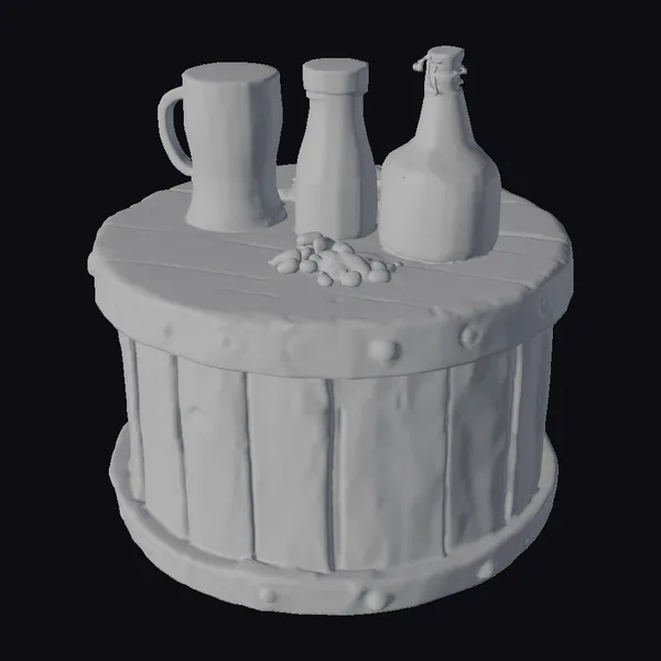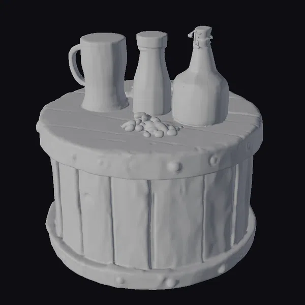 Perched on a wooden barrel with metal bands, a frothy mug of beer sits alongside two bottles, one clear and one brown, each with a cork stopper. A small pile of hops adds a pop of color and texture to the scene. The barrel’s wooden slats and metal accents are meticulously detailed, inviting you to step into a quaint pub setting. Ideal for games, animations, or designs seeking a rustic, welcoming ambiance.