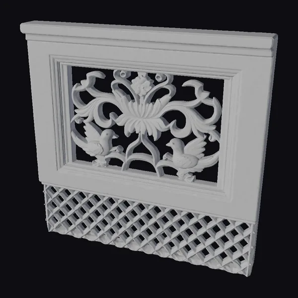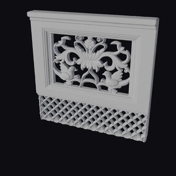 Positioned at a slight angle, the wooden carved wall panel showcases a meticulously designed lattice base that adds a layer of texture and depth. Above, a stunning floral pattern emerges, intricately carved with swirling green leaves and vibrant pink flowers. A pair of birds nestle within the design, adding a touch of life and movement. The entire piece is framed by a rich brown border, accented with gold that enhances the ornate details. The contrast between the lattice base and the ornate floral section creates a captivating visual effect. This panel is perfect for adding a touch of elegance and craftsmanship to games, 3D environments, or architectural visualizations.