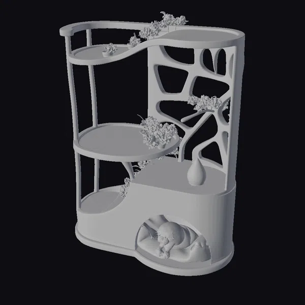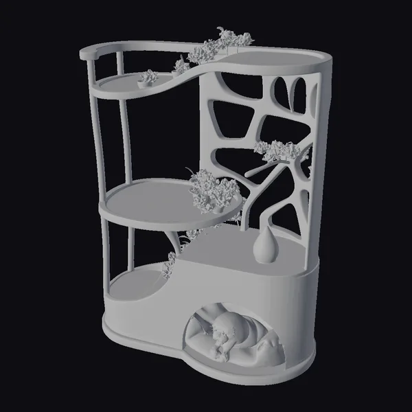 Crafted from light-colored wood, this intricately designed cat tree features multiple levels, each with a unique shape and texture. The tower’s organic structure is reminiscent of tree branches, with curved cutouts and rounded edges. Lush greenery sprouts from various nooks, adding a touch of natural beauty. A small, white cat finds a cozy retreat in the tower’s base, surrounded by soft cushions. The model’s attention to detail, from the wood grain to the cat’s plush fur, makes it perfect for 3D rendering, animation, or architectural visualization projects. Ideal for pet lovers and those who appreciate modern, eco-friendly design.