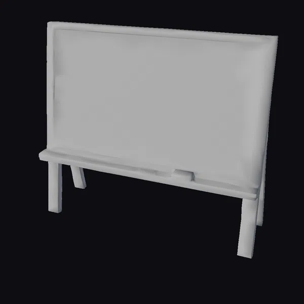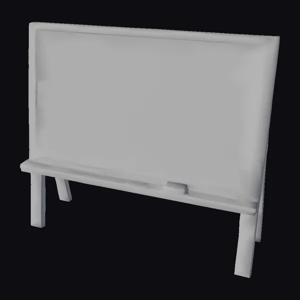 Positioned at a slight angle, the chalkboard’s green surface shows faint chalk scribbles in the top left corner, giving it a used yet well-maintained appearance. The wooden stand, with its simple but sturdy design, supports the board firmly. The ledge underneath holds a few pieces of chalk and an eraser, ready for use. The overall setup evokes memories of traditional classrooms and is perfect for educational or design projects. Its realistic look makes it suitable for 3D rendering in animations, games, or architectural visualizations.