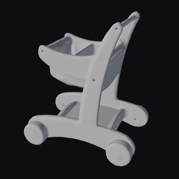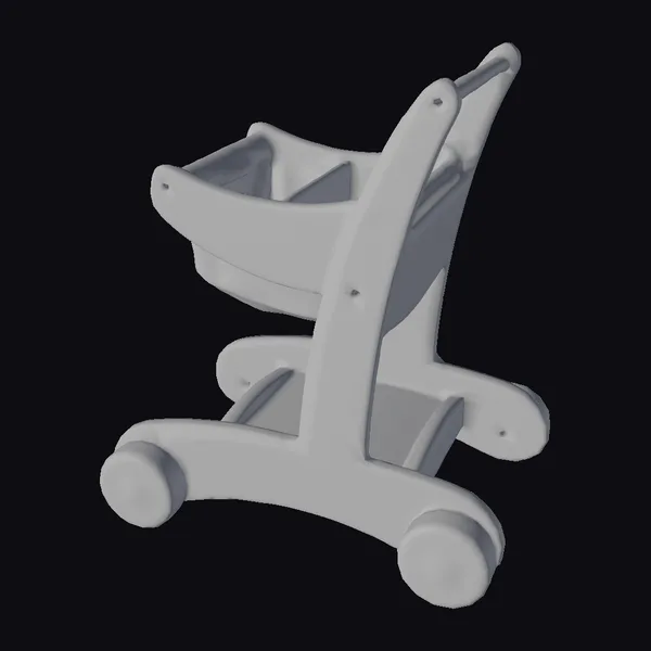 Positioned at a dynamic angle, the wooden doll stroller showcases its sturdy frame, smooth curves, and bold red wheels and interior. A white sign with indistinct text adds a touch of realism to the model. The stroller’s wooden texture and subtle wear give it a lifelike appearance. Ideal for use in 3D modeling projects, animations, or games, this model brings a sense of warmth and playfulness to any scene. Its detailed design and realistic proportions make it perfect for creating immersive environments or showcasing products.