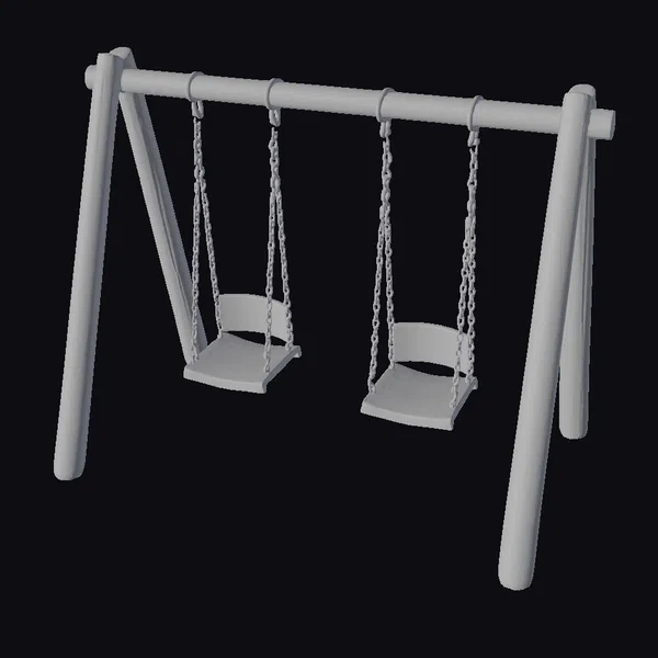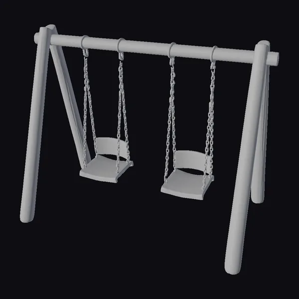 Positioned dynamically against a clean backdrop, this wooden double swing set showcases its sturdy A-frame structure and smooth wooden beams, supporting two swings with detailed wooden seats and sleek metal chains. The texture of the wood and the shine of the metal chains add a layer of realism, making it perfect for scenes requiring a touch of nostalgia or a playful atmosphere. Ideal for use in architectural visualizations, film and game environments, or as a decorative piece in virtual reality experiences.