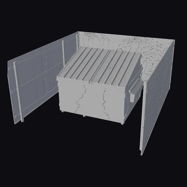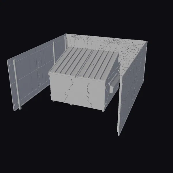 Positioned at the center of a simulated outdoor setting, the dumpster enclosure presents itself with a worn, wooden fence that appears to be crafted from aged planks. The fence panels, slightly ajar, frame the green dumpster with a black corrugated metal lid. The wood’s weathered look suggests years of exposure to the elements, while the dumpster’s surface hints at heavy use. This 3D model excels in scenarios requiring a realistic, somewhat rustic backdrop, such as architectural visualizations, games, or animations aiming for a grounded aesthetic. Its detailed textures and accurate proportions make it suitable for close-up shots or as a contextual element in larger scenes.