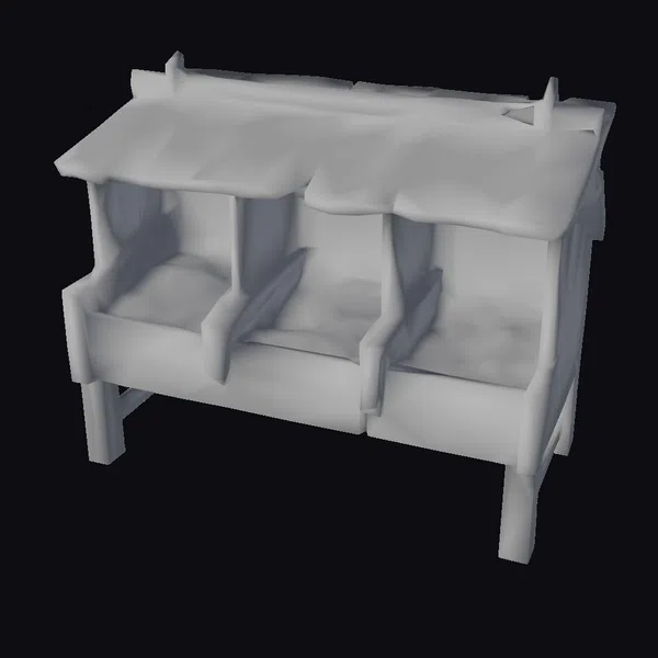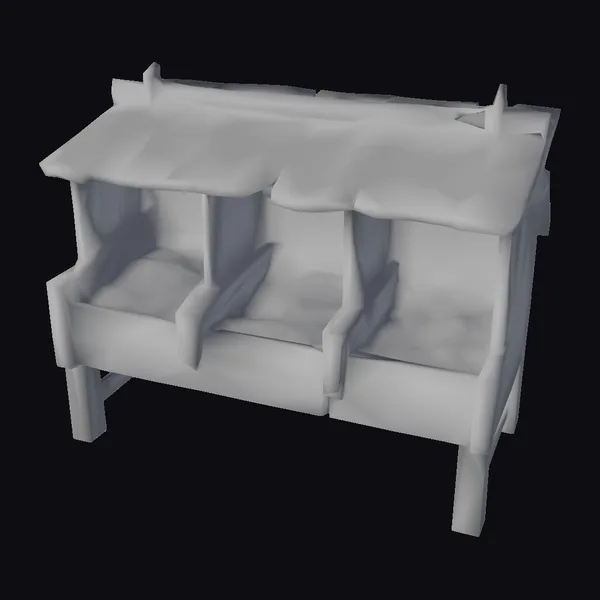 Nestled in a sturdy stance, the wooden feeder station boasts a slatted roof and a body made of wooden planks, exuding a sense of rustic simplicity. Two compartments, each filled with golden feed, are divided by a central partition, suggesting a practical design for organized feeding. The texture of the wood and the slight shadowing under the roof add depth to this piece. Ideal for scenes set in the countryside, farms, or rustic settings, this model can enhance games, 3D environments, animations, or architectural visualizations with its authentic look.