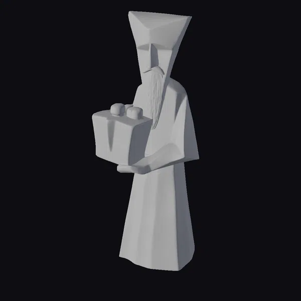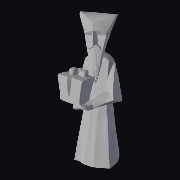 In a pose that suggests serene presentation, the wooden gift bearer stands with a geometrically shaped gift box adorned with three rounded objects on top. The figure’s stylized form features a tall, triangular headpiece and a long, flowing robe, all crafted from wood with a focus on clean lines and minimal detail. The texture of the wood grain adds a natural, earthy feel to the piece. The stylized appearance makes it versatile for various applications, including games, 3D printing, virtual reality, animation, and design projects. Its abstract nature allows it to blend into or stand out in any scene, depending on the context.