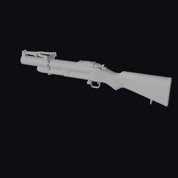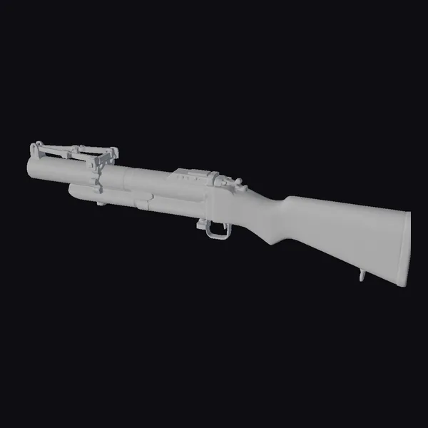 Positioned at a dynamic angle, the launcher’s wooden stock showcases a rich, reddish-brown hue with darker accents, while the metal components are rendered in a sharp, matte black. The cylindrical barrel and attached sight give the model a utilitarian, combat-ready appearance. Intricate details such as the trigger mechanism and magazine release add to its realism. Ideal for projects requiring a military or tactical element, this model can enhance scenes in games, animations, or architectural visualizations. Its high fidelity makes it suitable for close-up shots or detailed design work.