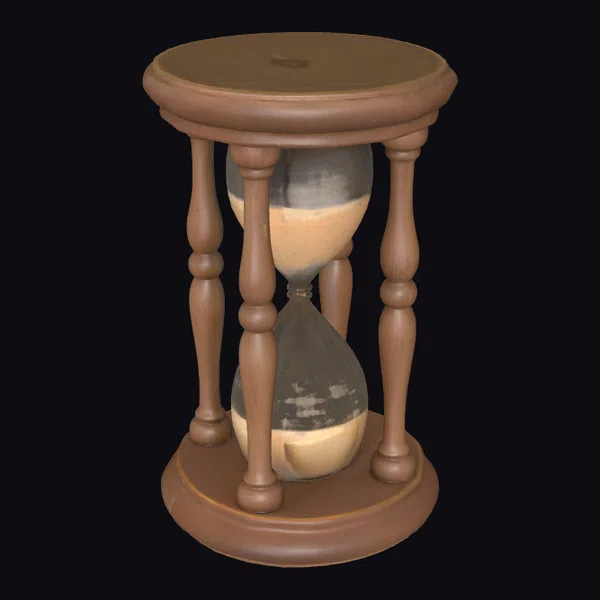 The wooden hourglass stand boasts a sturdy base and four ornate legs that support the hourglass with precision. The hourglass itself features a beautiful blend of dark and light brown hues, with a subtle sheen that catches the light. The stand’s surface exhibits a smooth, worn finish, adding to its vintage charm. This model is perfect for use in interior design visualizations, historical or period-specific projects, or as a decorative element in animations and games. Its detailed texture and realistic proportions make it an excellent choice for designers and artists seeking authentic, high-quality models.