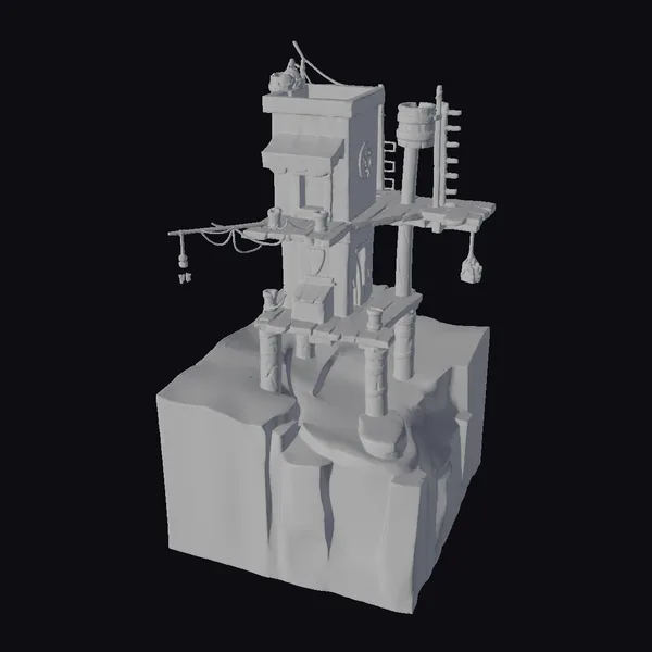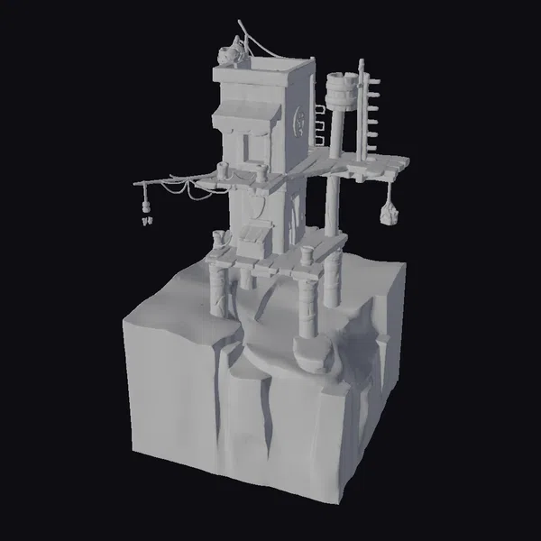 Nestled on a vibrant teal cliffside, this wooden retreat boasts a sturdy structure with a warm, inviting glow. The building’s wooden texture and earthy tones blend seamlessly with the surrounding environment. A red awning above the window adds a pop of color, while a fishing net and bucket suspended from the side create a sense of activity. The retreat’s design is characterized by a mix of flat and angled surfaces, with a prominent bucket and pulley system on the right side. The overall effect is one of playful, seaside whimsy. Ideal for use in games, animation, or architectural design projects, this model brings a touch of coastal charm to any scene.