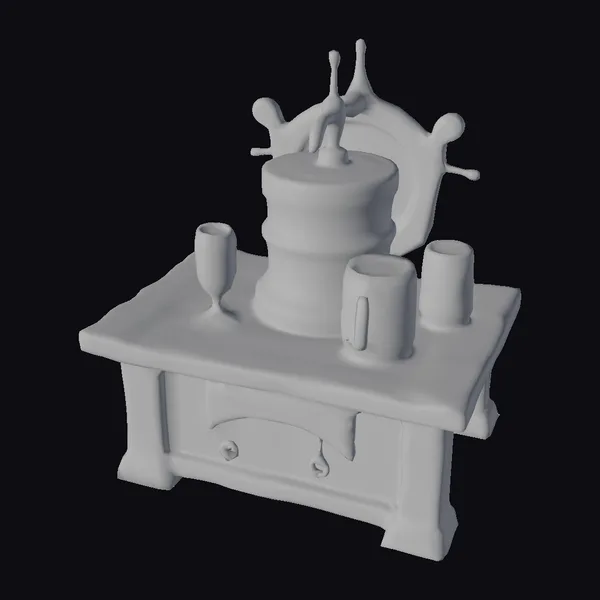 Crafted with meticulous attention to detail, this wooden kegger table setup presents a charming, rustic aesthetic. The table’s surface boasts a warm, honey-brown wood grain with darker accents, suggesting a well-worn patina. A wooden keg, reinforced with metal bands, sits prominently on the table, accompanied by three metal drinking vessels – two mugs and a goblet. Adding a dash of adventure to the scene is a ship’s wheel positioned behind the keg, its presence evoking tales of seafaring exploits. The table itself features a sturdy wooden base with a lower shelf, perfect for storing additional kegs or supplies. This setup is ideal for creating immersive environments in games, 3D print projects, VR/AR experiences, animations, or design visualizations, offering a unique blend of rustic charm and functional detail.