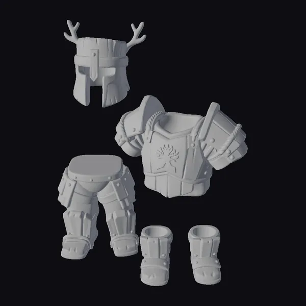 Crafted with meticulous attention to detail, this wooden knight armor set is a marvel of fantasy design. The set includes a helmet with antlers, symbolizing strength and connection to nature, a chest plate with an embossed tree, signifying growth and resilience. The gauntlets, greaves, and boots are designed with a rustic wooden texture, complemented by metal accents and ropes, adding a touch of realism to the overall aesthetic. Each piece is carefully articulated, allowing for a range of poses and movements. This armor set is perfect for projects requiring a medieval fantasy feel, such as games, animations, or architectural designs. The wooden material gives it a unique, earthy feel, setting it apart from traditional metal armors.