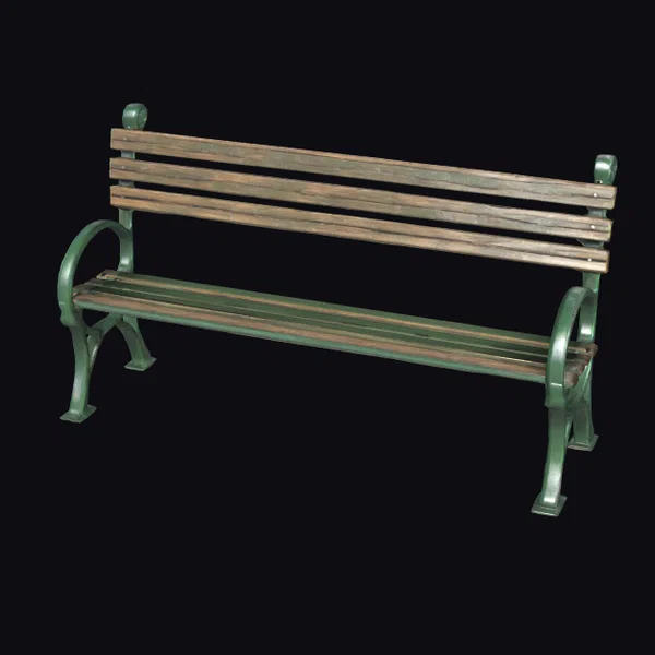 Perched on sturdy green metal legs, the three wooden slats of the bench seat and backrest appear worn from countless afternoons spent basking in the sun. The verdant hue of the metal frame adds a pop of color against the muted tones of the wood, creating a visually appealing contrast. As the light catches the bench, the textures of the weathered wood and metal come alive, inviting the viewer to imagine lazy summer days spent lounging in the park. Whether used in a game, animation, or architectural visualization, this bench is sure to add a touch of warmth and character to any scene.