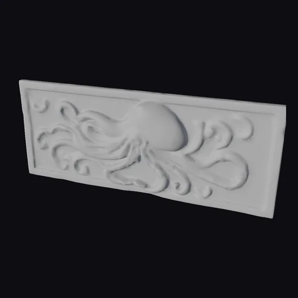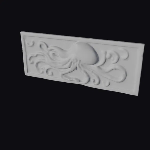 This exquisite wooden relief sculpture showcases a squid in remarkable detail, its tentacles stretching across the rectangular wall with a sense of fluid motion. The rustic wood finish and intricate textures evoke a sense of history and craftsmanship. The squid’s large eye and suckers on its tentacles are meticulously carved, adding to the overall sense of realism. This piece would be perfect for use in games, 3D printing, VR/AR experiences, animation, and design projects, where a touch of oceanic elegance is desired.