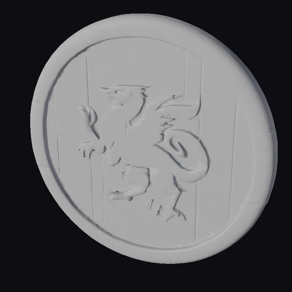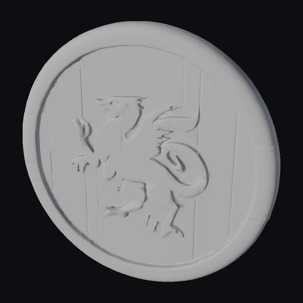 This intricately designed wooden round shield boasts a sturdy appearance, with a raised crest at its center. The crest showcases a dark silhouette of a gryphon, its wings spread and claws outstretched, set against a background of alternating yellow and green stripes. The shield’s wooden texture is meticulously detailed, with visible planks and a smooth, rounded edge. The gryphon’s silhouette is accentuated by subtle green highlights, adding depth to the design. This shield model is perfect for use in games, 3D printing, VR/AR experiences, animation, and design projects, offering a touch of medieval flair and fantasy adventure.