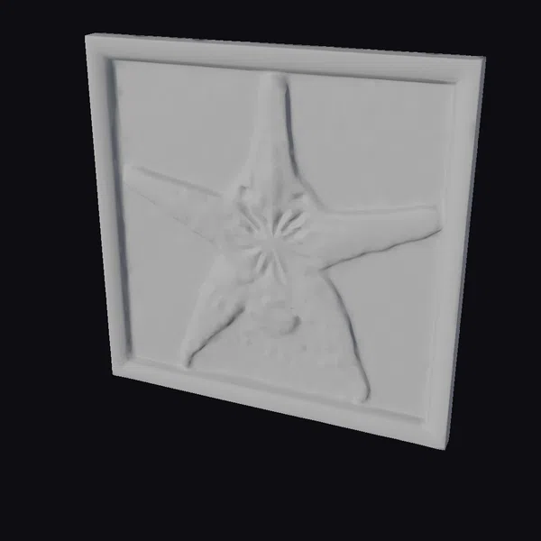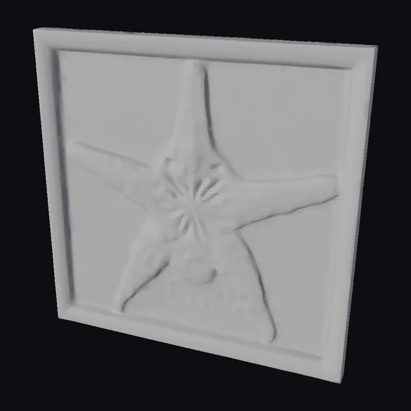 Intricately carved into a wooden panel, a stunning sea star takes center stage, its five arms stretching outward with remarkable detail. The sculpture’s textured surface features a mesmerizing array of raised dots and lines, mimicking the natural patterns found on a sea star’s skin. A warm, golden hue adorns the star’s center and tips, adding a touch of elegance. The surrounding ocean scene, complete with undulating waves and scattered sea stars, creates an immersive atmosphere. This beautiful piece is perfect for marine life enthusiasts, gamers, and designers seeking unique 3D models for projects, such as animation, print, or VR/AR experiences.
