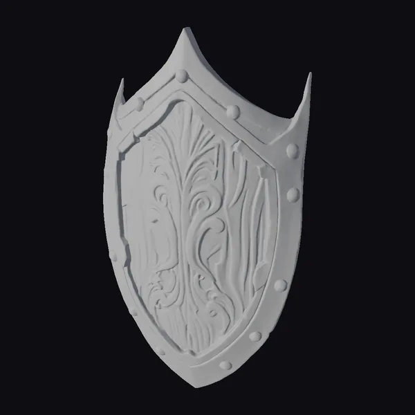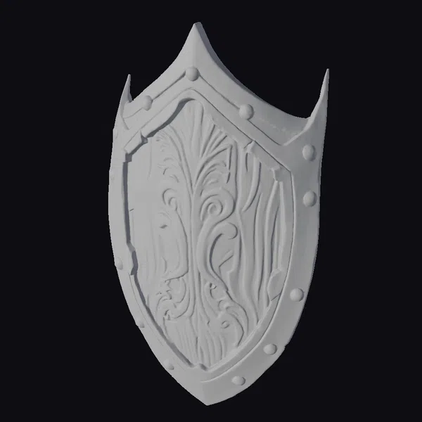 The shield’s wooden core boasts an ornate carved pattern, reminiscent of ancient craftsmanship. The metal rim, complete with rivets, adds a touch of ruggedness to this fantasy shield. Its proportions and details make it perfect for use in games, 3D printing, VR/AR experiences, animation, and design projects. The shield’s texture and lighting are meticulously crafted to create a realistic and immersive visual effect.