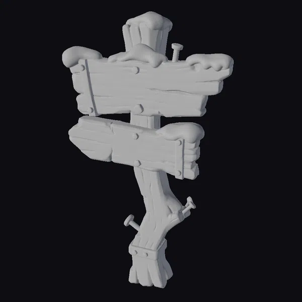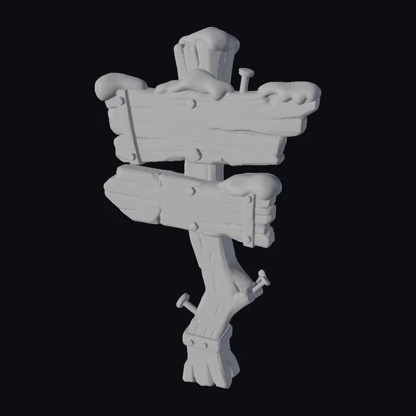 This intricately detailed wooden signpost stands as a testament to the whimsy of a dark Christmas fantasy village. The post itself appears crooked, as if the land has shifted over time, while the boards are cracked and worn, telling tales of seasons past. Faded paint symbols in hues of red and green cling to the wood, hinting at ancient lore. Snowflakes have settled on the signpost’s peaks, adding a touch of serenity to the scene. As a 3D model, it invites use in games, animations, or architectural visualizations seeking a dash of mystique. Designers can integrate this signpost into their projects to evoke a sense of wonder and curiosity.