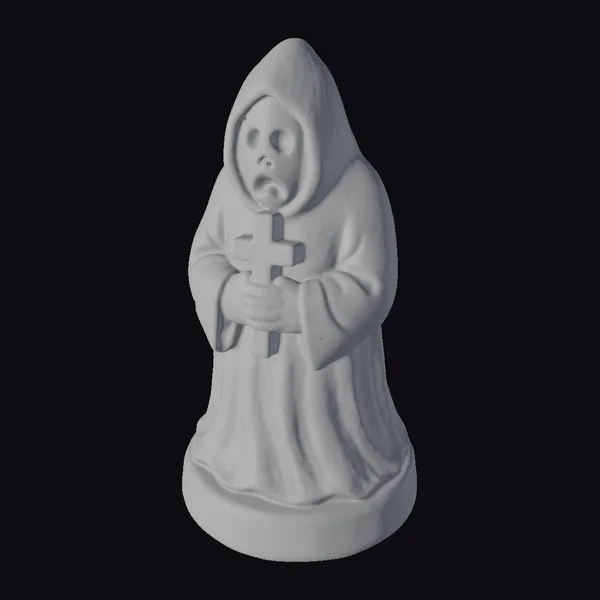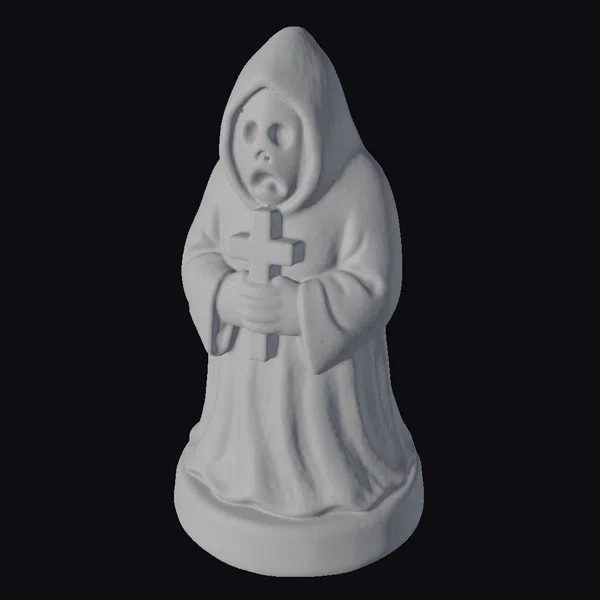 Standing with a solemn posture, the wooden skeleton bishop is draped in a hooded robe that flows elegantly around its base. The figure’s skeletal face, visible through the hood’s opening, features a somber expression, while its hands clasp a traditional cross. The model’s wooden texture showcases a rich, brown hue with subtle grain details, enhancing its realistic appearance. The base, also made of wood, provides stability and completes the statue’s imposing stance. This model is ideal for use in games, 3D printing, virtual reality, animation, and design projects, particularly those with a dark, gothic, or fantasy theme.