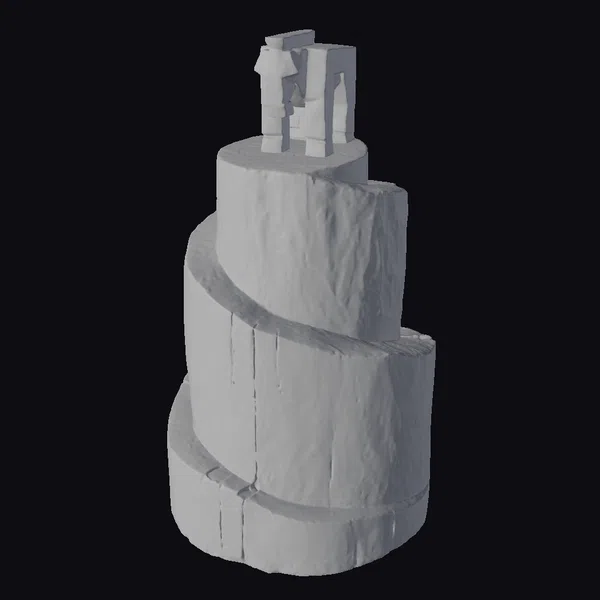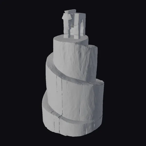 Perched atop a foundation of lighter, almost golden-hued wood, the tower’s base gives way to progressively darker, charred planks, as if the very heart of the structure has been scorched by time and magic. The middle and top tiers boast a slightly lighter tone, suggesting a gradient of age and exposure. A small, enigmatic dark metal piece crowns the tower, hinting at the mystical or technological marvels within. The model’s textures are richly detailed, with visible cracks and weathering that suggest a long history. Ideal for use in games, 3D printing, VR/AR experiences, animation, or architectural design projects seeking a touch of mystique and ancient power.