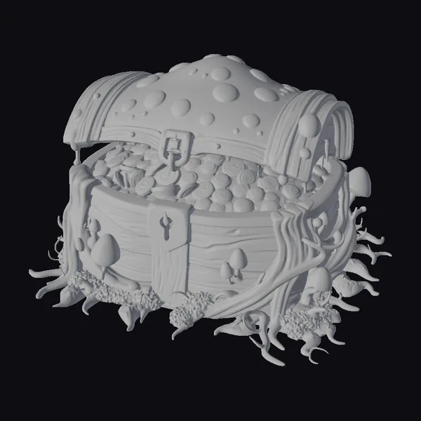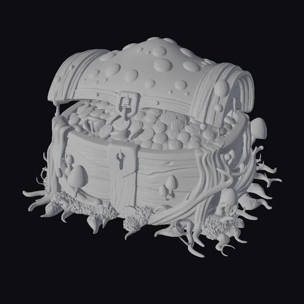 In a majestic pose, the wooden treasure chest overflows with a sea of glittering gold coins, as if freshly unearthed from a mystical realm. The chest’s wooden slats, weathered to a warm brown, are wrapped in gnarled roots that twist and turn like living vines. Glowing mushrooms sprout from the lid and sides, casting a soft, enchanted light on the surrounding environment. A sturdy lock and keyhole adorn the front, hinting at the secrets within. As a game asset, this treasure chest is perfect for creating immersive fantasy worlds, while its intricate details make it an excellent choice for animation and 3D printing projects.