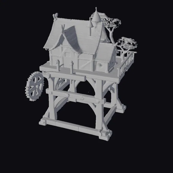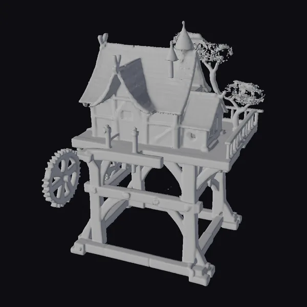 Nestled among the branches, this intricately designed treehouse features a richly textured wooden facade, complete with a steeply pitched roof and a cozy door adorned with a decorative window. The platform supporting the treehouse is held aloft by sturdy wooden beams, with a functional waterwheel adding a touch of rustic charm. A small tree grows from the platform, adding a pop of greenery to the scene. The model’s level of detail makes it perfect for use in games, animation, or architectural design, where a touch of fantasy and whimsy is desired.