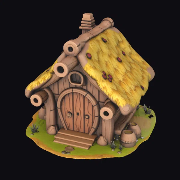 Nestled on a small grassy knoll, this enchanting wooden hut, reminiscent of a troll’s abode, boasts a sturdy structure composed of thick wooden logs. The roof, a bright yellow thatch with red berries scattered across it, adds a pop of color against the muted tones of the wooden walls and chimney. The door, adorned with a small circular window and a simple yet welcoming entrance, suggests a cozy interior. Surrounding the hut, a few pots and plants add to the rustic ambiance. This low-poly model, with its cartoonish yet detailed design, is perfect for projects requiring a touch of fantasy and whimsy, such as animations, games, or architectural visualizations.