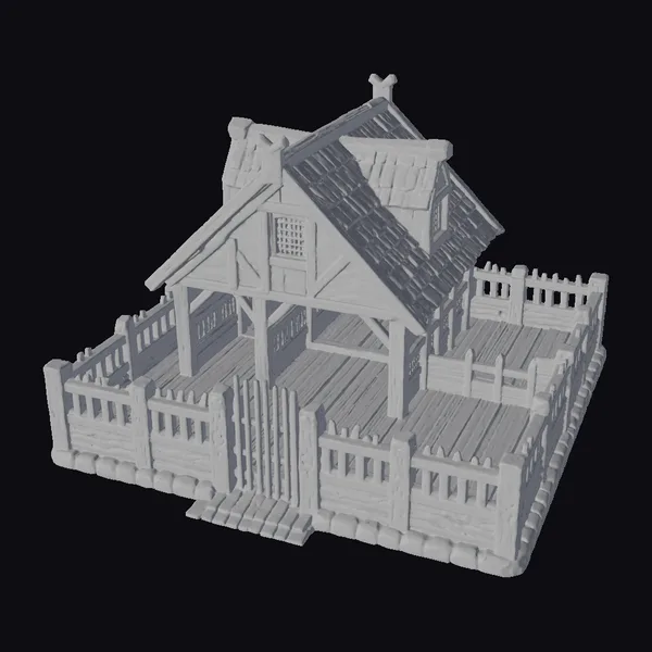 Nestled among the trees, this quaint wooden cottage boasts a sturdy stone foundation, providing a solid base for the weathered wooden structure. The slanted gray roof, adorned with a small window, allows for a glimpse into the cozy interior. A spacious porch, supported by wooden pillars, invites relaxation and contemplation. The surrounding wooden fence, complete with a gate, adds a touch of rustic charm to the property. This 3D model is perfect for games, animation, and architectural design projects, offering a unique blend of fantasy and realism. The intricate details, from the wooden beams to the stone foundation, make this model an excellent choice for those seeking a high-quality, realistic 3D environment.