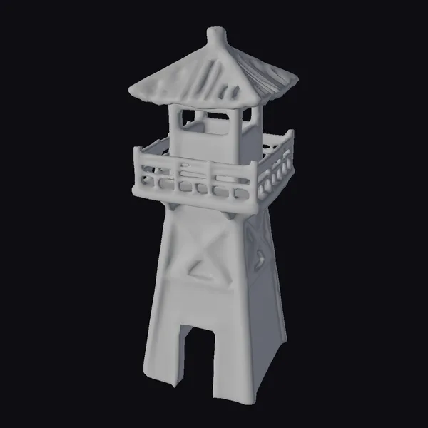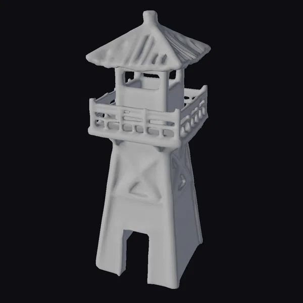 Crafted with meticulous attention to detail, this wooden watchtower boasts a sturdy base, a watchful balcony, and a roof that appears to be thatched with wooden slats. The intricate textures and weathered finish suggest a rich history, as if the tower has stood sentinel for centuries. Its compact size belies its grandeur, making it an ideal addition to fantasy landscapes, games, or architectural visualizations. Whether used to survey the surrounding countryside or serve as a hideout for adventurers, this watchtower is sure to inspire.