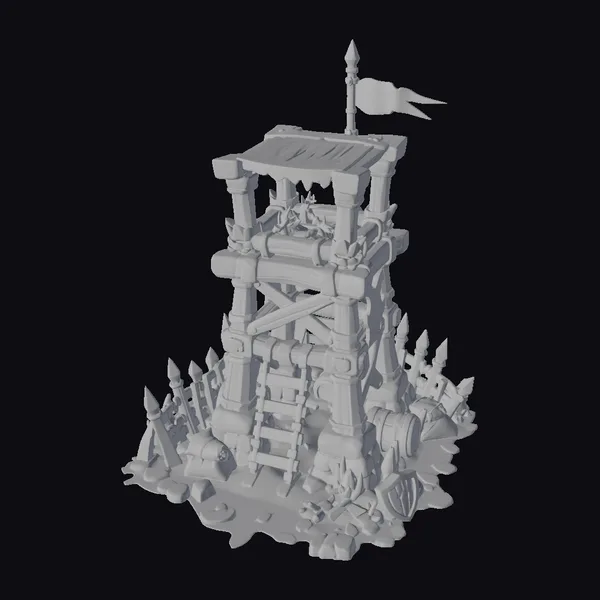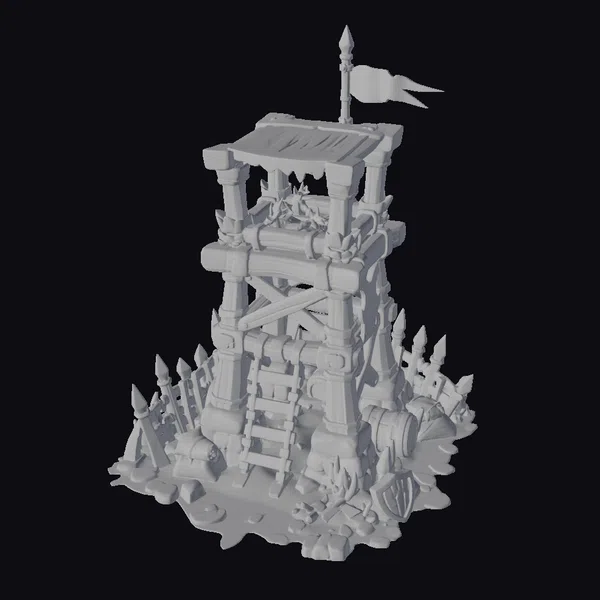 Crafted with meticulous attention to detail, this wooden watchtower model boasts a sturdy stone foundation, supporting a structure of interlocking wooden beams and planks. The roof, a striking blue and white striped canvas, appears worn and frayed, as if battered by the elements. A small fire crackles at the base, casting a warm glow on the surrounding wooden palisade and the tower’s rustic charm. The model’s intricate textures and weathered appearance evoke a sense of history and resilience. Ideal for use in games, animations, or architectural designs, this watchtower model brings a touch of medieval authenticity to any project.