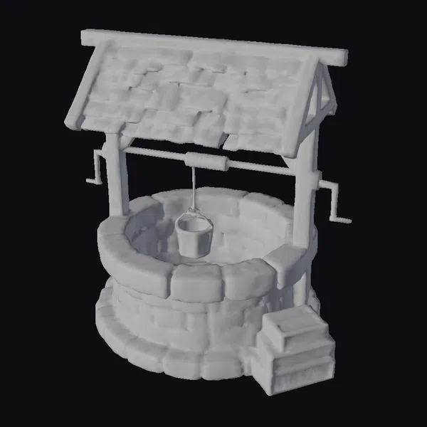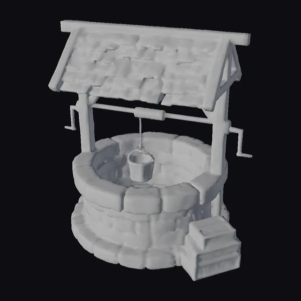 Perched atop a circular stone base, this wooden well structure boasts a sturdy frame and a tiled roof with a warm, earthy color palette. The well’s bucket, suspended from a wooden beam, appears ready to draw water from the depths below. The surrounding stone walls, adorned with moss and lichen, contribute to the well’s aged, rustic charm. Two wooden chests sit at the base of the well, suggesting a storied past. This 3D model is perfect for adding a touch of rural charm to games, animations, or architectural visualizations. Its intricate details and realistic textures make it an excellent choice for designers and artists seeking to create immersive environments.
