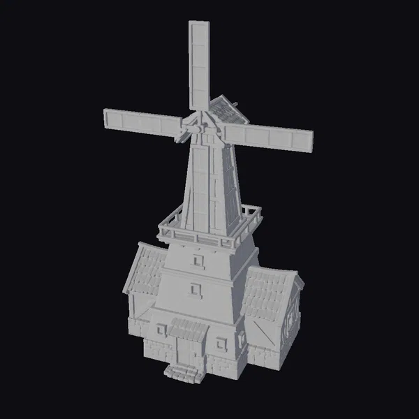 In a picturesque scene, a stylized wooden windmill sits atop a cozy house, its white walls and yellow roof complemented by brown wooden accents. The windmill’s lattice-bladed structure and tall, narrow tower add a touch of rustic elegance, while the house’s stone foundation and half-timbered design evoke a sense of history. The model’s intricate details make it perfect for use in games, 3D printing, VR/AR experiences, and animation projects. The stylized approach ensures a balance between realism and artistic expression, making it suitable for a variety of creative applications.