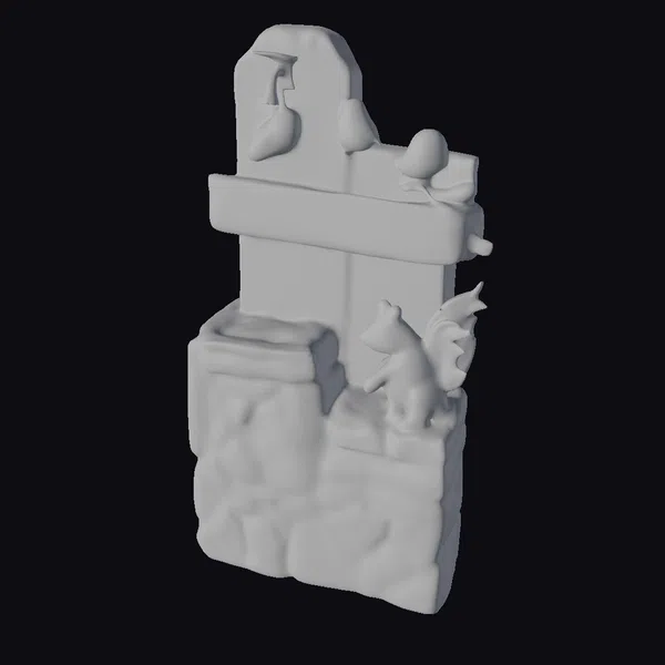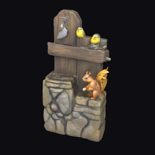 Nestled within a sturdy stone base, a weathered wooden post rises, supporting a lively gathering of forest creatures. A bushy-tailed squirrel stands poised on the stone wall, its gaze directed upwards at three bright yellow birds perched on the post. A metal bird feeder hangs enticingly from the post, adding a touch of rustic charm. The stylized textures and vibrant colors bring this woodland scene to life, perfect for use in games, animations, or as a decorative 3D model. The intricate details and lifelike poses of the animals invite the viewer to step into a serene forest setting.