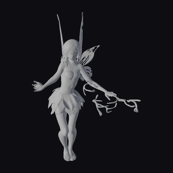 In a majestic pose, the woodland fairy stands with one leg crossed over the other, her bare feet sinking into the mossy ground. Her leafy green dress, crafted from what appears to be living foliage, flows around her like a river of leaves. The fairy’s wings, a mesmerizing blend of green and white, shimmer with a soft, magical light. A twisted branch wand, adorned with gnarled twigs, extends from her hand, pulsing with an otherworldly energy. As she twirls, her dress seems to come alive, leaves rustling softly. This enchanting model is perfect for games, animation, or 3D printing, transporting viewers to a world of wonder and magic.