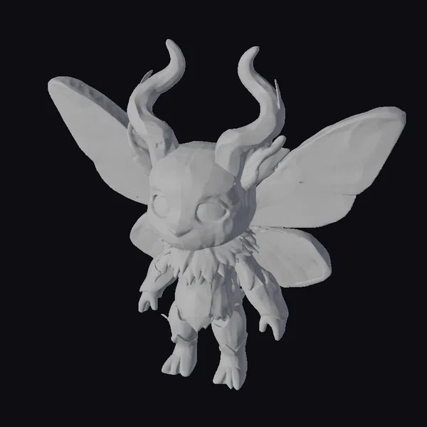 Deep within an enchanted forest, a radiant wooden creature comes to life. This stylized fairy creature stands with its legs slightly apart, as if ready to take flight or explore its surroundings. Its body is crafted from light wood with darker brown lines that mimic the grain of tree bark, while its large, round eyes shine with a warm, amber light. Two curved horns sprout from its forehead, adding to its mystical aura. The wings, resembling those of a butterfly, are a beautiful blend of light and dark brown, with cream-colored spots that add to the creature’s whimsical charm. The texture of the wood grain and the delicate patterns on the wings are meticulously detailed, making this creature a delightful addition to any fantasy setting. Whether you’re creating a game, animation, or virtual reality experience, this woodland sprite is sure to enchant your audience.