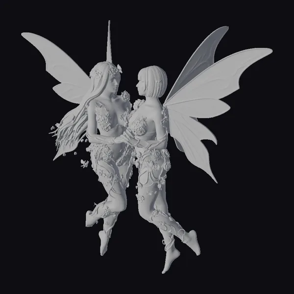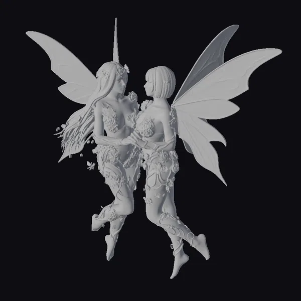 In a captivating display of fantasy artistry, this 3D model depicts two fairies in a slow dance posture, their bodies facing each other. The fairies are nude, with their skin tones subtly shaded to emphasize their natural beauty. Their hair is styled in contrast, one with long blonde locks adorned with flowers, the other with short black hair with a single flower tucked behind her ear. Delicate floral patterns and green vines cover their bodies, complemented by large, dark wings that appear both strong and fragile. The model showcases intricate details such as butterflies fluttering around them, adding a dynamic element to their serene dance. The fairies’ pose, with hands gently touching, conveys a sense of intimacy and connection. This model is perfect for use in games, animation projects, VR/AR experiences, and design work where a touch of fantasy and nature’s beauty is desired.