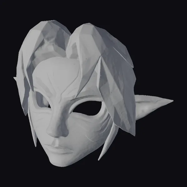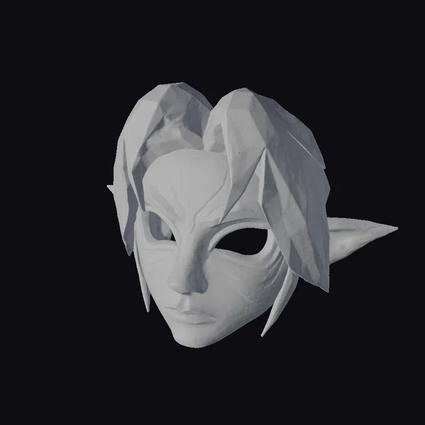 Crafted with meticulous attention to detail, this woodland spirit mask boasts a richly textured, wooden complexion that appears almost lifelike. The green hair, with its subtle yellow undertones, cascades down the sides, framing the face with an air of mysticism. The red accents around the eyes seem to glow with an inner light, while the blue markings on the forehead pulse with an ancient power. As the mask gazes out, its pointy ears add to its fantastical allure. This model is perfect for those who seek to infuse their projects with a touch of the mystical and unknown, whether in games, animation, or design.