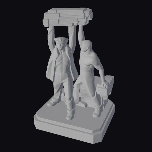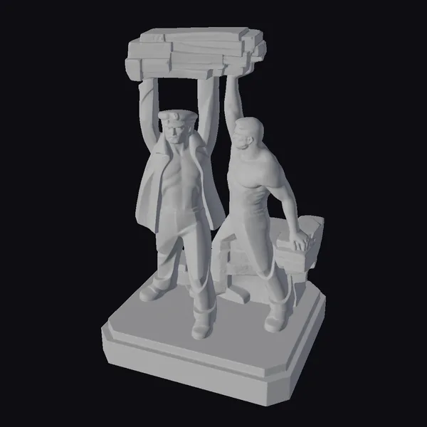 Positioned on a sturdy black base, two workers are captured in a moment of intense physical labor. The worker on the left, donning a cap and coat, stands with feet shoulder-width apart, arms raised to support the weight of stacked blocks. To his right, the second worker, shirtless and muscular, supports the blocks with one hand while resting the other on a nearby stone structure. The model’s realistic style brings to life the textures of gray stone and the grueling effort of the workers. Ideal for use in architectural visualizations, historical reenactments, or as a standalone piece in 3D printing projects, this model adds a touch of realism and narrative depth.