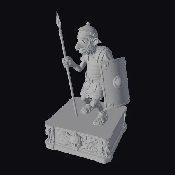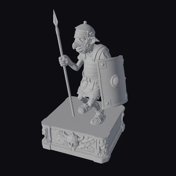 Detailed with meticulous care, this stylized Roman guard figurine showcases a wounded warrior in a comically exaggerated pose. Perched atop a pedestal adorned with golden accents and a grimacing skull, the guard’s facial features are a masterclass in caricature – a large, red nose, a thick, white mustache, and a bandaged forehead all contribute to its humorous demeanor. Clad in a mishmash of armor and a green tunic, the guard grips a spear and shield, symbols of his unyielding stance. The pedestal itself, stained with blood, adds a touch of drama to the scene. This figurine can be a fantastic asset for projects requiring a blend of history, fantasy, and humor, such as animations, games, or conceptual designs.