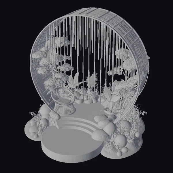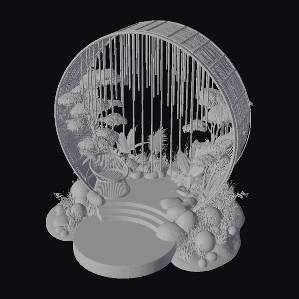 Deep within a serene environment, a stunning woven circle garden nook beckons, showcasing a harmonious blend of natural materials and lush vegetation. The nook’s woven structure, crafted from light-colored wood or bamboo, features a unique blend of vertical and horizontal elements, creating a sense of depth and visual interest. The interior boasts a cozy seating area, complete with a small table and chair, surrounded by an array of plants and greenery, including ferns, moss, and other foliage. The scene is set against a clean white background, allowing the natural beauty of the nook to take center stage. This 3D model is perfect for use in architectural visualizations, interior design projects, or as a decorative element in games, animations, or VR/AR experiences.