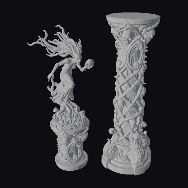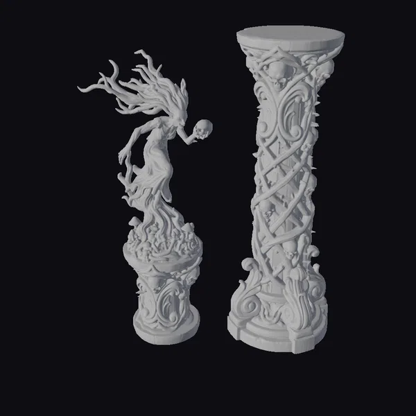 Perched atop a foreboding column, the wraith’s elongated form appears to be crafted from the very darkness itself. Her wild, dark hair flows like tendrils of night, framing a face that is both beautiful and terrifying. The column, a masterpiece of dark fantasy design, features intertwining vines and a multitude of skulls, creating an aura of eerie mysticism. The wraith’s tattered gown seems to blend with the shadows, while her grasp on a skull speaks of a deep, haunting sorrow. This 3D model, with its rich textures and detailed craftsmanship, is perfect for those looking to add a touch of the macabre to their projects, whether in gaming, animation, or virtual reality.