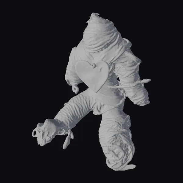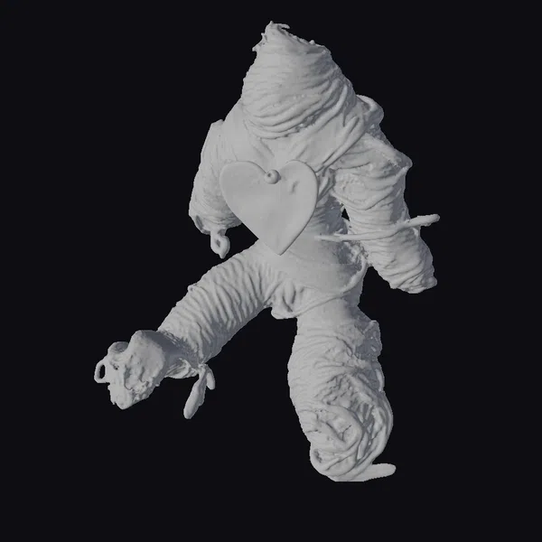 This stylized mummy figurine is meticulously wrapped in threads, showcasing a unique blend of fantasy and playfulness. The blue heart on its chest, secured with a pink pin, adds a touch of charm and color to its ancient appearance. Positioned in a dynamic stance, the mummy exudes a sense of movement and life. Its detailed wrapping and textured appearance make it a captivating piece for various applications, including games, 3D printing, VR/AR experiences, animation, and design projects. The figurine’s stylized features and vibrant accessories ensure it stands out in any setting.
