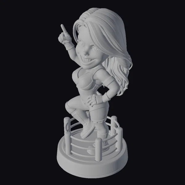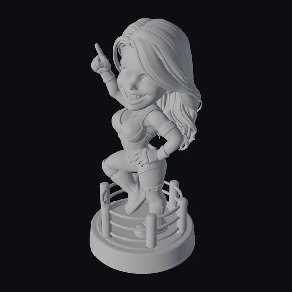 Detailed with precision, this stylized figurine showcases a female wrestler in a vibrant red, black, and white wrestling outfit, complete with matching boots and wristbands. Her long, flowing hair transitions from dark brown to blonde, adding a touch of personality to her appearance. Standing on a wrestling ring base, complete with tiny fencing details, she points upwards with a defiant gesture. Her facial expression, marked by a bright smile and engaging gaze, brings a sense of dynamism and charm. This model is perfect for projects requiring a stylized yet spirited character, suitable for use in animations, games, or as a unique decorative piece.