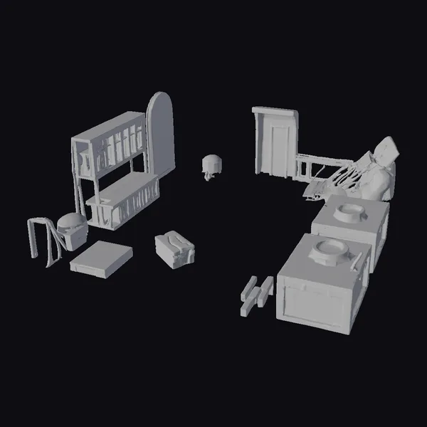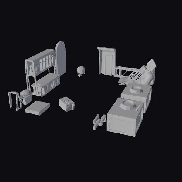 Deep within the bowels of a WW2 bunker, the remnants of a once-thriving military outpost lie shrouded in a perpetual twilight. The scene unfolds with a collection of worn industrial components: a disassembled shelving unit, its metal frame corroded and flaking, stands alongside wooden pallets that have seen better days. A pair of stoves, their surfaces bearing the scars of time and neglect, sit silently, as if waiting for a long-forgotten meal. A doorway, once a sturdy gateway, now hangs askew, a testament to the relentless passage of time. This 3D model is perfect for projects requiring a gritty, realistic setting, such as historical dramas, war simulations, or architectural studies. Its detailed textures and accurate proportions make it an invaluable asset for game developers, animators, and designers seeking to create immersive environments.